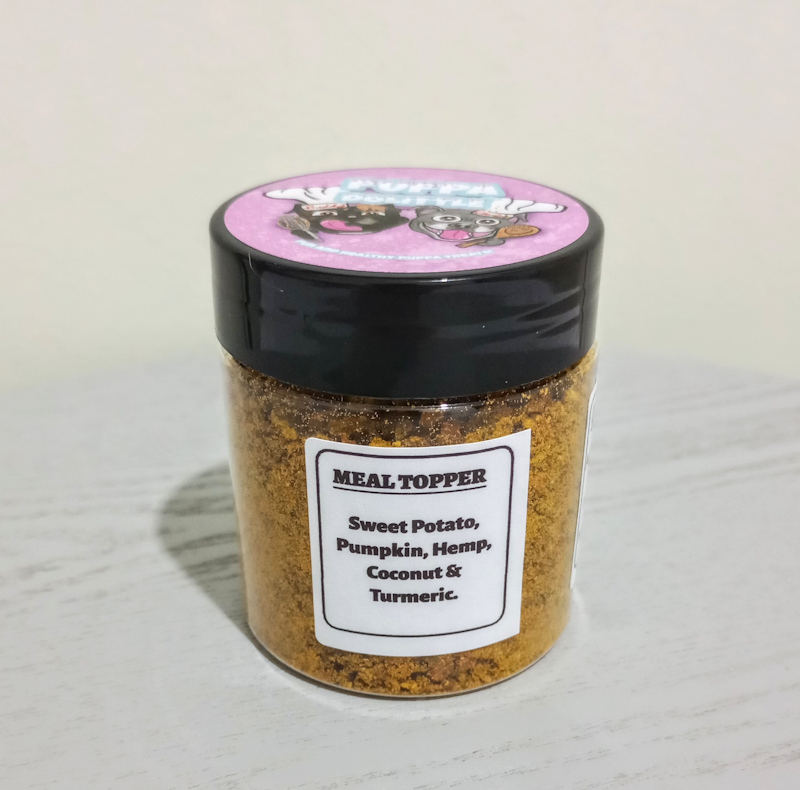 Our Sweet Potato & Pumpkin Meal Topper comes in a min 65g Jar for you to top off your furbabies dinner with a tasty health boost.